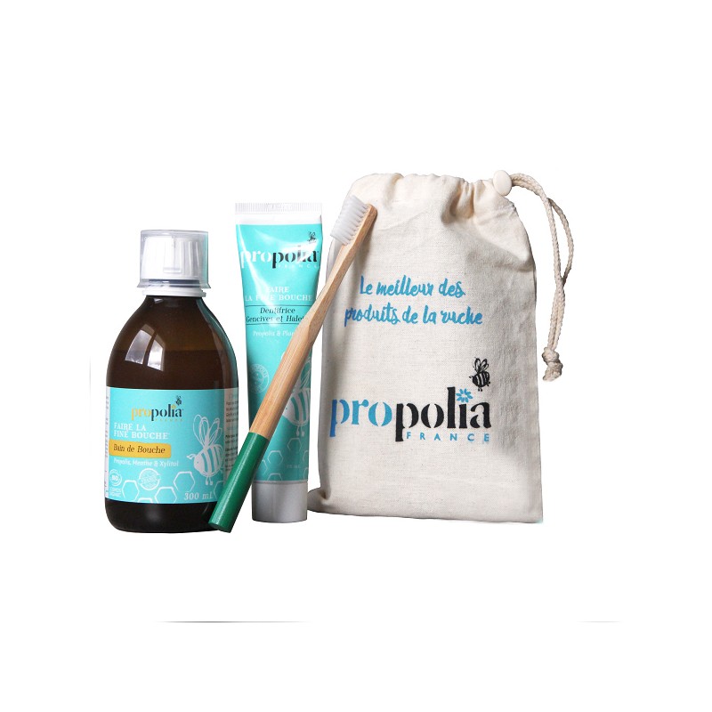 Cet indispensable des soins bucco-dentaires contient un dentifrice, une brosse à dent et un bain de bouche regroupé dans un sac en coton.